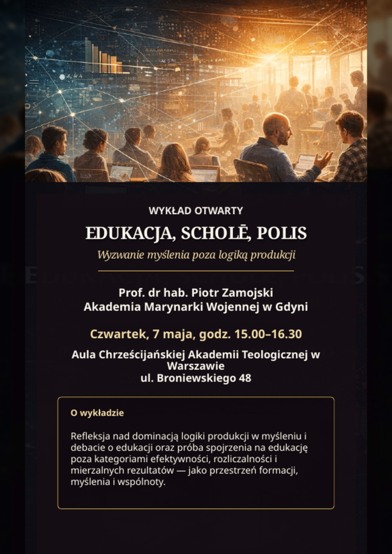 Chrześcijańska Akademia Teologiczna w Warszawie serdecznie zaprasza na otwarty wykład prof. dr. hab. Piotra Zamojskiego z Akademii Marynarki Wojennej w Gdyni, który odbędzie się w czwartek, 7 maja, w godz. 15.00–16.30, w auli Chrześcijańskiej Akademii Teologicznej w Warszawie przy ul. Broniewskiego 48.